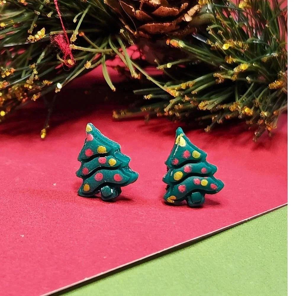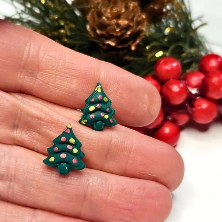 These whimsical earrings are handcrafted from polymer clay, featuring a delightful evergreen tree design adorned with colorful ornaments. Crafted with stainless steel stud posts, they’re comfortable to wear and nickel-free, making them a safe and stylish choice for all-day wear.