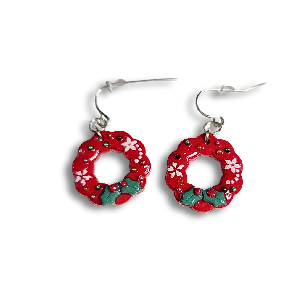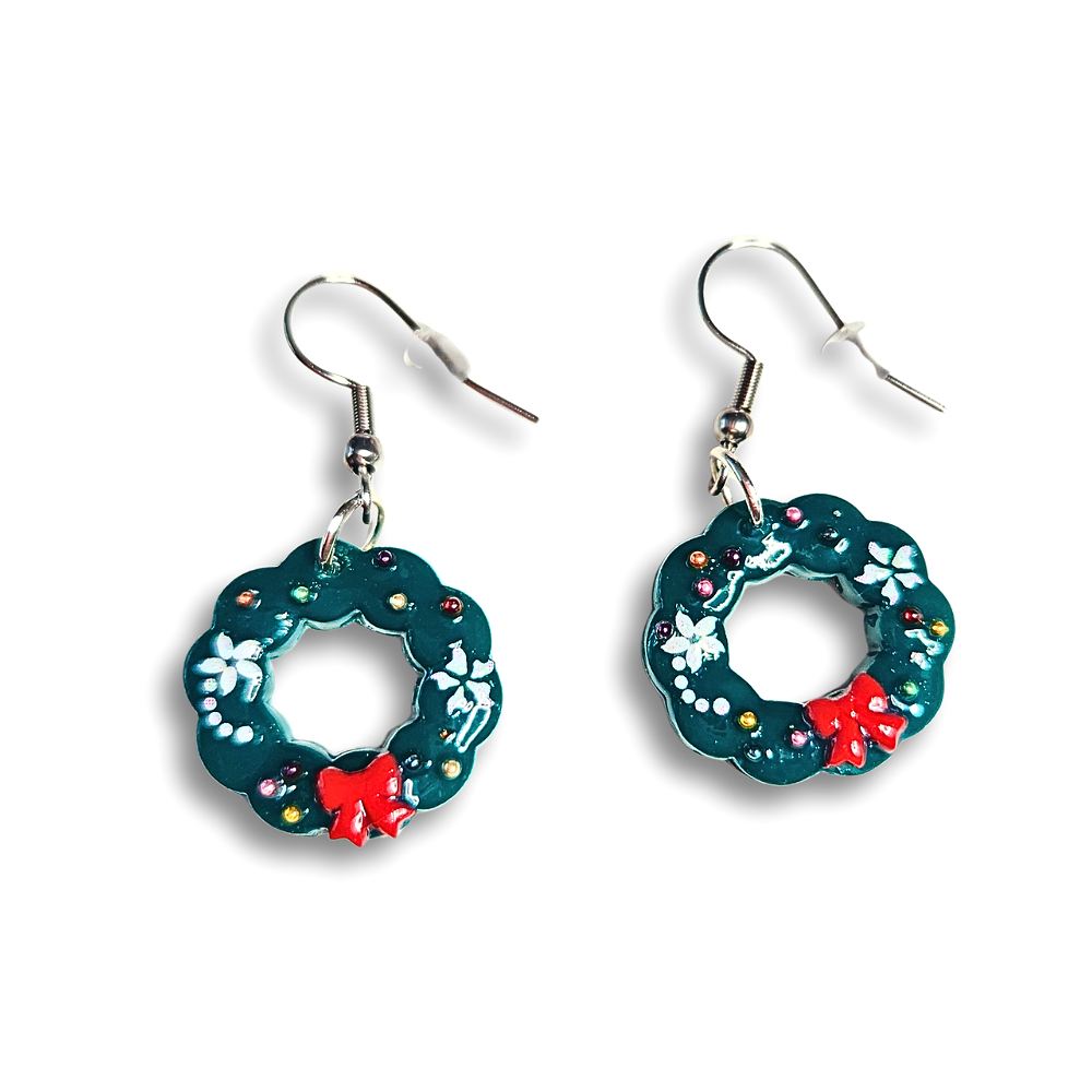Celebrate the season in style with these charming Christmas Wreath Dangle Earrings, available in festive red or green. Each wreath is lovingly handmade from durable polymer clay, adorned with tiny bows, colorful baubles, and delicate holly accents for a whimsical holiday touch.