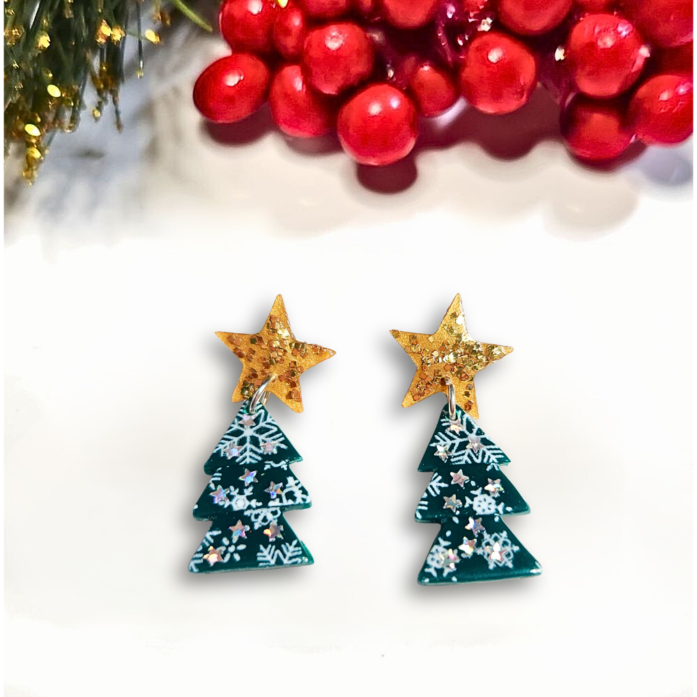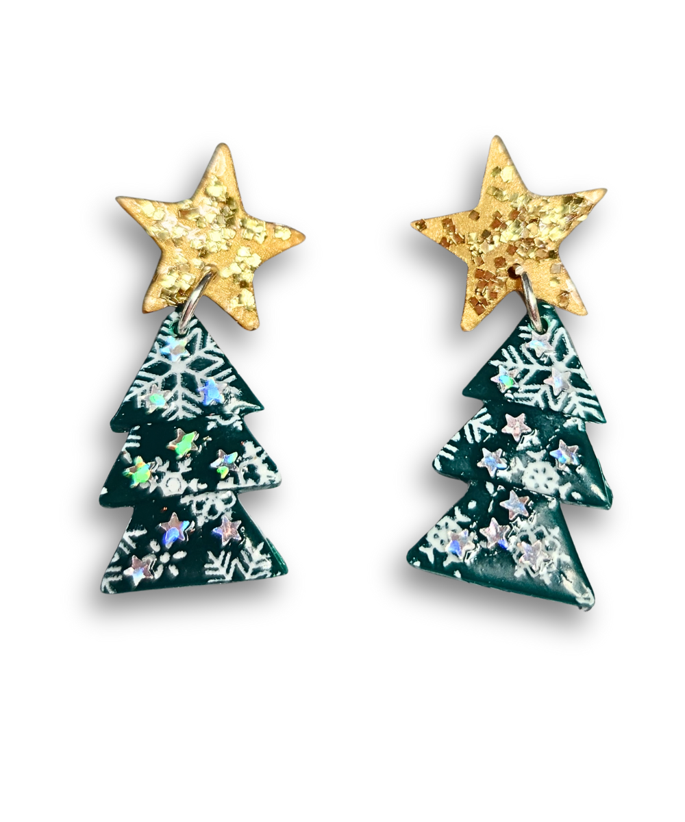 Add a festive sparkle to your holiday outfit with these Star-Topped Christmas Tree Earrings. Each earring is carefully handcrafted into a charming Christmas tree design, decorated with white snowflakes and topped with a shimmering gold glitter star stud. Made with stainless steel stud posts, they’re lightweight, comfortable, and perfect for sensitive ears.