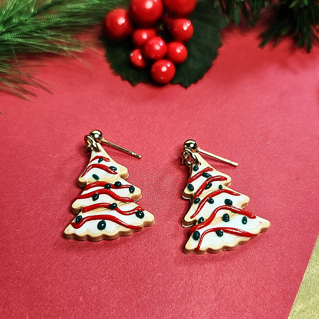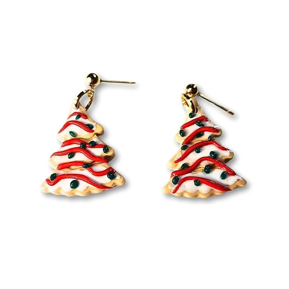 These whimsical earrings capture the festive spirit of the season, resembling the beloved Little Debbie Cakes we all know and love. Frosted in white and topped with green ornaments, these earrings are the perfect accessory to add a joyful, playful touch to your holiday outfits.